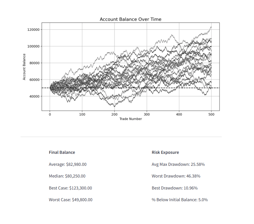 A Monte Carlo simulation tool used to model the performance distribution of a trading system. Input parameters are defined by the user. The outcome is presented as equity curves and statistical summaries.