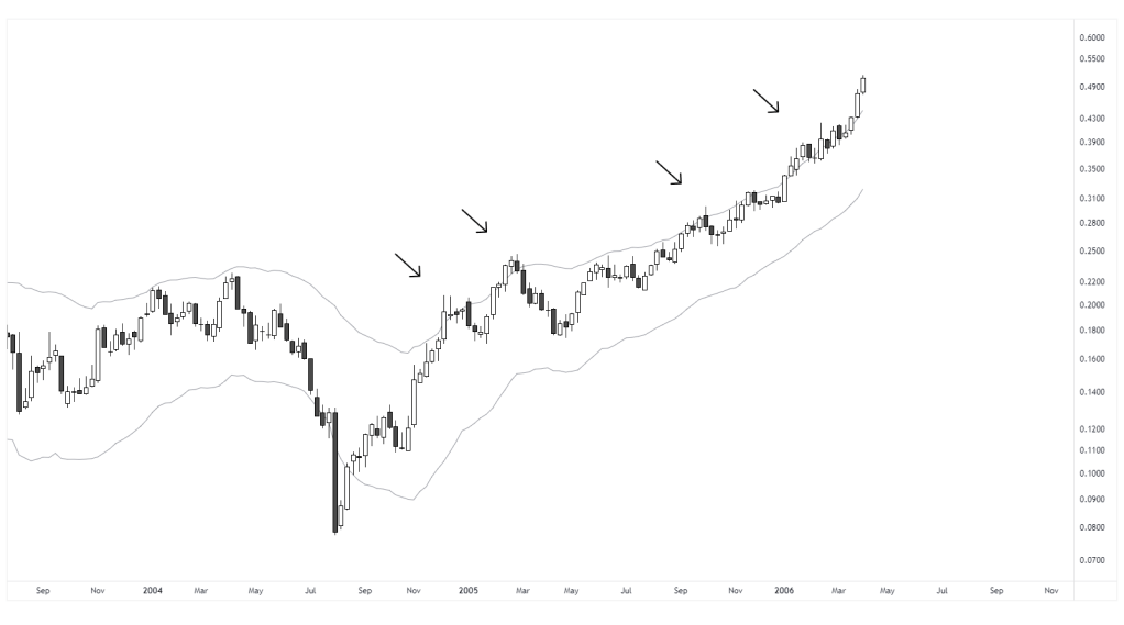In this chart, price moves outside the upper envelope on two separate occasions, each showing a deviation from recent average behavior. In the first case, the move results in a successful reversion. In the second, price remains extended above the band for several weeks, maintaining persistent momentum. Both instances show similar values, but the outcomes were different. This illustrates that tools should not be interpreted in isolation.
