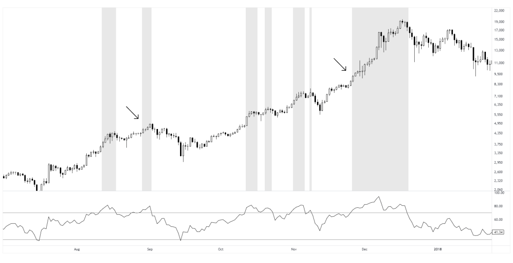 In this chart, RSI reaches overbought levels on two separate occasions. In the first case, the overextension is followed with a mean reversion. In the second, the same condition marks the beginning of a strong upward momentum move. Both events show similar indicator values, but the results were different. This reinforces that identical values can lead to different outcomes depending on the context and underlying structure.