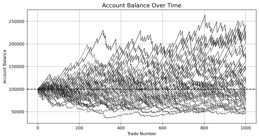 Across 50 simulation runs of 1,000 trades each, the average final balance was $118,109. The best case ended at $240,858, while the worst case dropped to $47,090. The average maximum drawdown was over 43%, and the worst drawdown reached nearly 70%. Half of all simulations finished below the starting balance. These results illustrate that while most trades may perform as expected, rare but oversized losses can and do occur. Despite a strong win rate, the long-term outcome becomes increasingly dependent on avoiding a handful of catastrophic trades.
