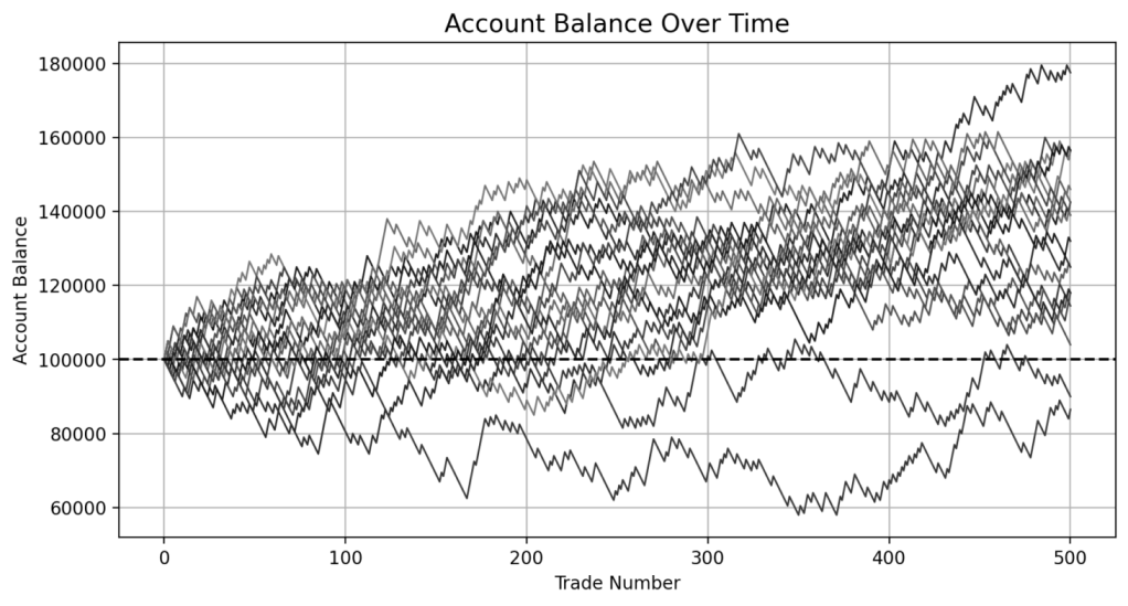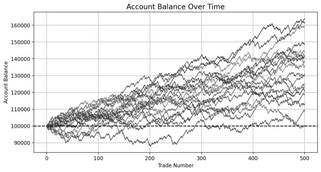 While most runs clustered around a profitable outcome consistent with the positive expected value, several outliers demonstrated the impact of sequencing. When 250 trades had been done, one account was up more than 60% while another was down nearly 40%. In one run, the account more than doubled by the end of the 500 trades. In another, it failed to generate any meaningful profit across the entire sequence. These differences occurred not because of flaws in the system, but because of randomness in the order of outcomes.