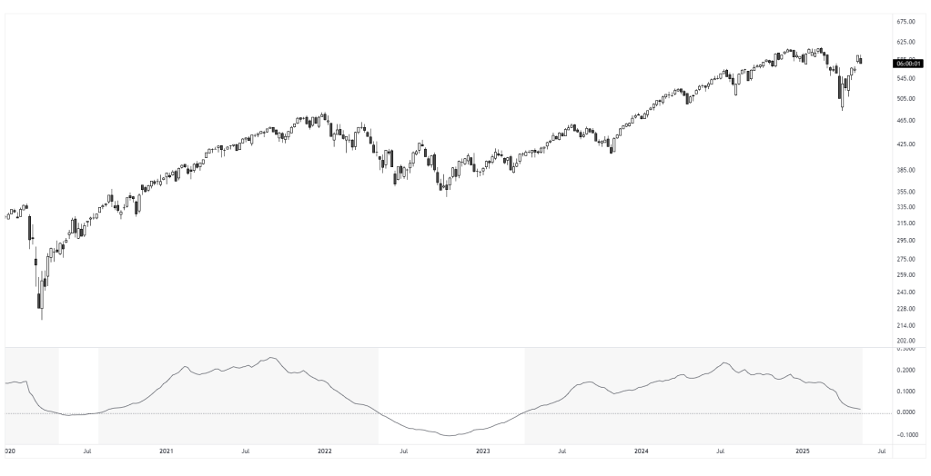 A visual example of momentum, showing the slope of a linear regression line over a rolling window. Positive values indicate upward movement, negative values indicate downward movement.